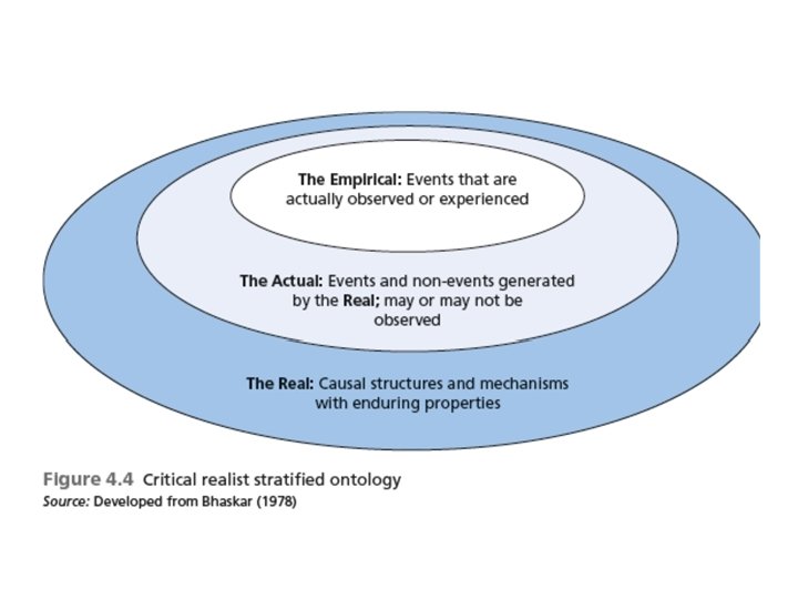 Major philosophies • Positivism (=direct realism): working with an observable social reality to produce law-like generalizations. • Critical realism: explains what we experience in terms of the underlying structures of reality. • Interpretivism: it studies humans created meanings. • Postmodernism: it questions the accepted ways of thinking and give voice to alternative ones. It emphasizes the role of language and power relations. • Pragmatism: concepts are only relevant when they are supporting action.