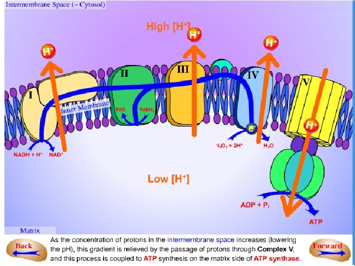 Proton pump: Electron transport is coupled to the phosphorylation of ADP by the transport (“pumping”) of protons (H+) across the inner mitochondrial membrane from the matrix to the intermembrane space. The energy generated by this proton gradient is sufficient to drive ATP synthesis. The proton gradient serves as the common intermediate that couples oxidation to phosphorylation. ATP synthase: The enzyme complex ATP synthase (complex V) synthesizes ATP, using the energy of the proton gradient generated by the electron transport chain.