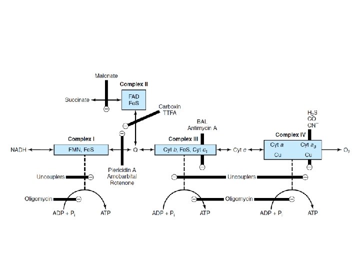 MANY POISONS INHIBIT THE RESPIRATORY CHAIN • Classification – Inhibitors of the respiratory chain – Inhibitors of oxidative phosphorylation • Atractyloside , transporter – Uncouplers of oxidative phosphorylation