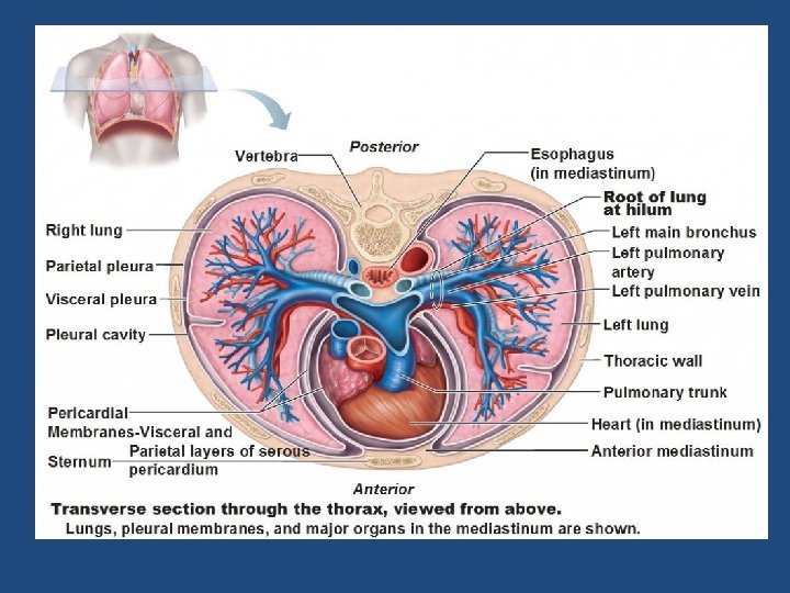 Pleura Thin membrane that lines thoracic cavity and covers organs and structures in the thorax Visceral layer covers thoracic organs and structures Parietal layer lines the cavity Space between the two pleural layers is filled with a small amount of pleural fluid Helps ensure that surfaces of organs slide smoothly along the lining of the thorax during breathing