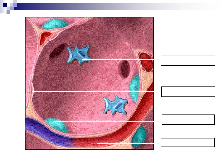 The Alveoli n n With each inhalation air passes by way of the bronchial tree to the alveoli. An alveolar sac is made up of simple squamous epithelium surrounded by blood capillaries. Gas exchange occurs between the air in the alveoli and the blood in the capillaries. The alveoli must stay open to receive the inhaled air if gas exchange is to occur. Gas exchange takes place across moist cellular membranes, and yet the surface tension of water lining the alveoli is capable of causing them to close up. The alveoli are lined with a surfactant, a film of lipoprotein that lowers the surface tension and prevents them from closing.