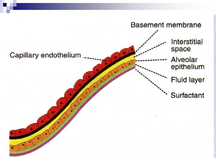 . Respiratory Membrane n n n Gas exchange occurs very rapidly because of the characteristics of the so-called respiratory membrane. The respiratory membrane consists of the juxtaposed alveolar epithelium and the capillary endothelium. At times, their basement membranes are fused, meaning that very little tissue fluid separates the two portions of the respiratory membrane and they are indeed one membrane. This membrane is extremely thin—only 0. 2– 0. 6 μm thick. The total surface area of the respiratory membrane is the same as the area of the alveoli, namely 50– 70 m 2.