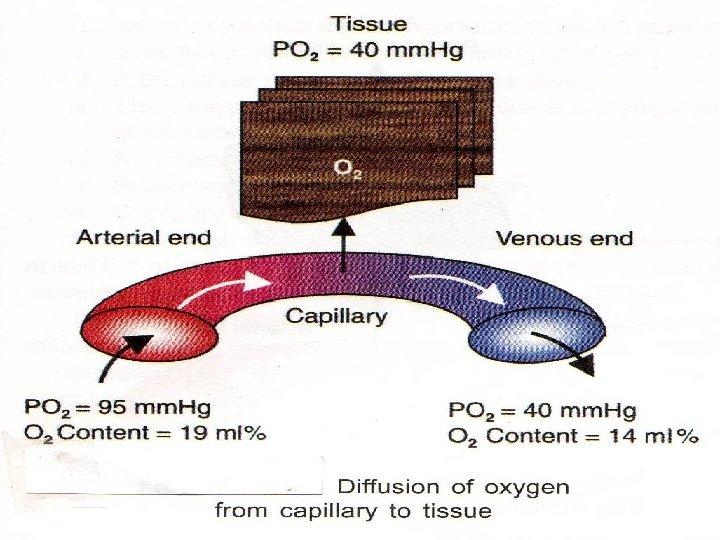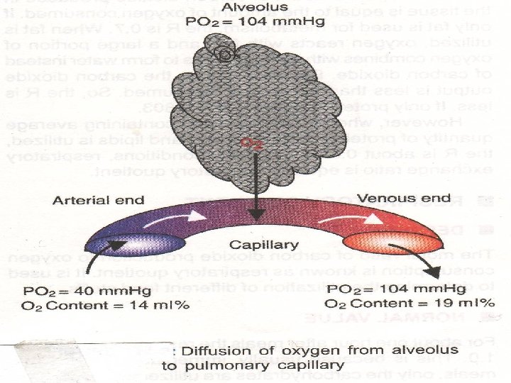 Diffusion of oxygen n n From Atmosphere to the Alveoli The partial pressure of oxygen in the atmosphere is 159 mm Hg and in the alveoli, it is 104 mm Hg. Because of the pressure gradient of 55 mm Hg, oxygen easily enters the alveoli from atmospheric air. From Alveoli into the Blood The partial pressure of oxygen in the pulmonary capillary is 40 mm Hg and in the alveoli, it is 104 mm Hg. The pressure gradient is 64 mm Hg. This facilitates the diffusion of oxygen from alveoli into the blood. In the venous blood, the volume of oxygen is 14 ml%. The content of oxygen in arterial blood is 19 ml%. Thus, the diffusion of oxygen from alveoli to blood is 5 ml/100 ml of blood.