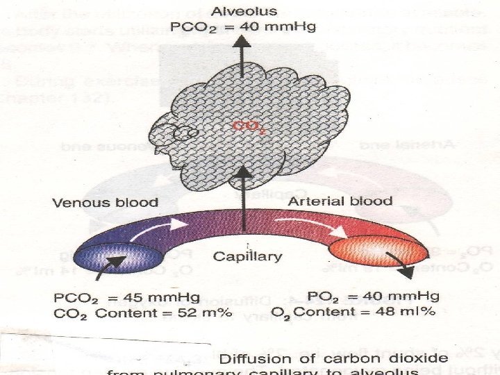 n n n Diffusion of carbon dioxide From Blood into Alveoli The partial pressure of carbon dioxide in alveoli is 40 mm Hg whereas in the blood it is 45 mm Hg. The pressure gradient of 5 mm Hg is responsible for the diffusion of carbon dioxide from blood into the alveoli. The carbon dioxide content in the venous blood is 52 ml % and in arterial blood, it is 48 ml %. So, the diffusion of carbon dioxide from blood to alveoli is 4 ml /100 ml of blood. From the Alveoli into the Atmosphere In the atmospheric air, the partial pressure of carbon dioxide is very insignificant and is only about 0. 3 mm Hg whereas, in the alveoli, it is 40 mm Hg. So, carbon dioxide leaves alveoli easily.