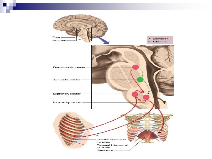 Control Centers in the Brainstem n n The other nucleus is the expiratory center, or ventral respiratory group (VRG). It has I neurons in its midregion and E neurons at its rostral and caudal ends. Its E neurons inhibit the inspiratory center when deeper expiration is needed. Conversely, the inspiratory center inhibits the expiratory center when an unusually deep inspiration is needed. The pons regulates ventilation by means of a pneumotaxic center in the upper pons and an apneustic center in the lower pons. The role of the apneustic center is still unclear, but it seems to prolong inspiration. The pneumotaxic center sends a continual stream of inhibitory impulses to the inspiratory center of the medulla. When impulse frequency rises, inspiration lasts as little as 0. 5 second and breathing becomes faster.