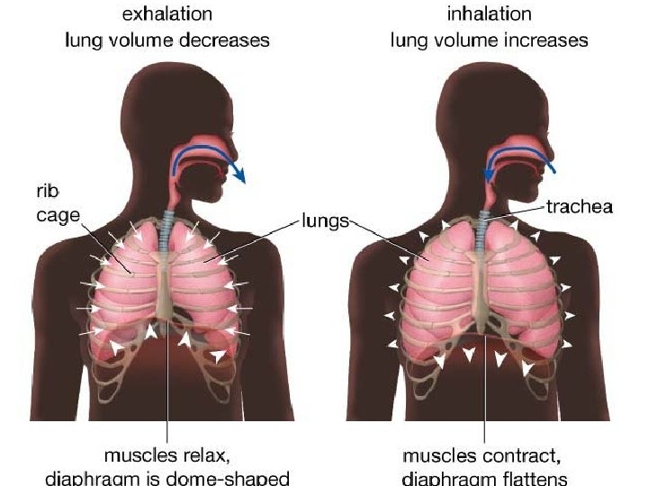 Breathing: • Inhaling: diaphragm muscle contracts, pushing down, allowing air to flow into lungs. Rib cage moves up/out • Exhaling – diaphragm and rib muscles relax and move up/in, pushing air out. Animation Cows lungs Animation 2