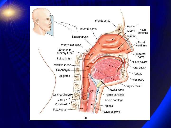 Airways conduct air between the atmosphere and alveoli. • Inhaled air passes through the following series of continuous airways in this sequence: 1. 2. 3. 4. 5. 6. Nasal passages Pharynx Larynx Trachea Bronchi (left and right) Bronchioles 7. Alveoli