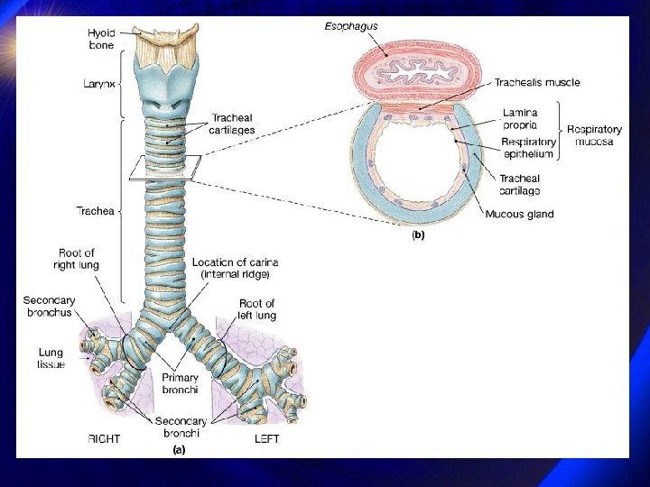 Air Passages continue from the Trachea • At the base of the trachea, this respiratory tract spits into a right and left bronchus. • The walls of the trachea and bronchi are reinforced with rings of cartilage. (holds windpipe open) • The bronchi continue to split into smaller tubes, bronchioles. The cartilage is absent in the bronchioles. • The bronchioles are smooth muscle tubes, capable of changing the airflow through them by dilating and constricting. • At the end of each bronchiole is a cluster of air sacs called: Alveoli