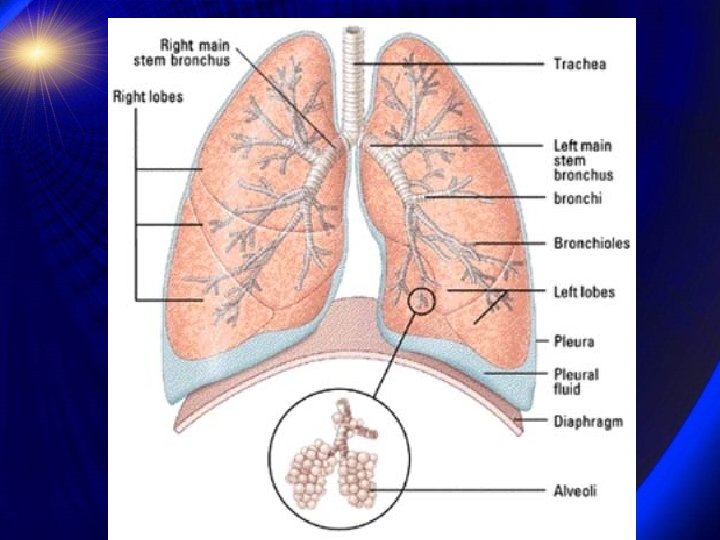 1 st: Getting O 2 into the body • • O 2 from the atmosphere into lungs (alveoli). (Pulmonary Ventilation) O 2 from the alveoli into pulmonary capillaries. (Pulmonary Diffusion) O 2 from lungs (pulmonary capillaries) to the tissues (blood/gas transport) O 2 from blood into the tissues. (Blood/ gas tissue exchange)