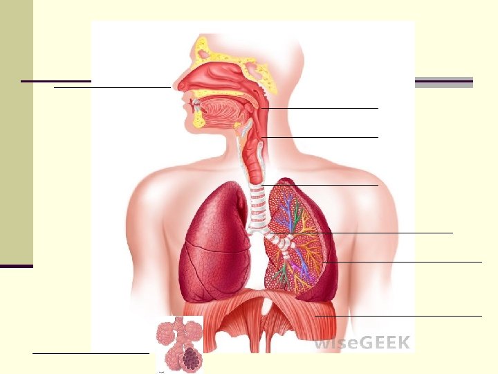 Some more terms… n 1. Pleura – thin mucous membrane film that covers the lungs n 2. Diaphragm – muscle which separates the lungs from the abdominal cavity n 3. Cilia – tiny hairs that line the respiratory tract to filter dust and other bacteria from inhaled air.