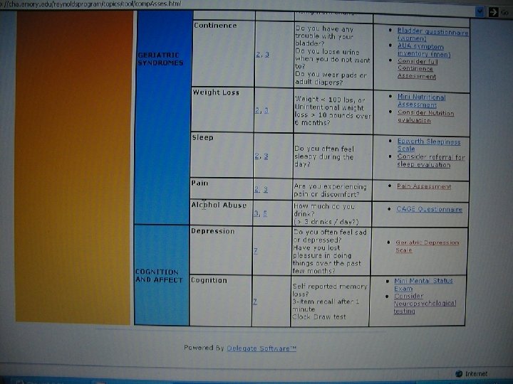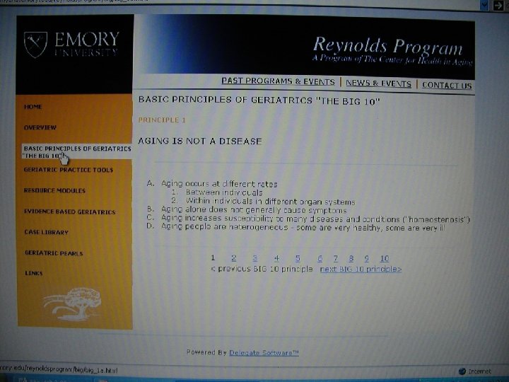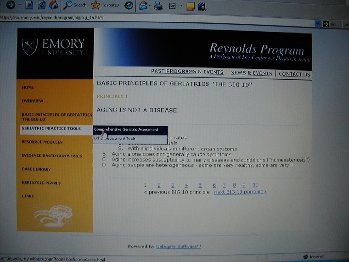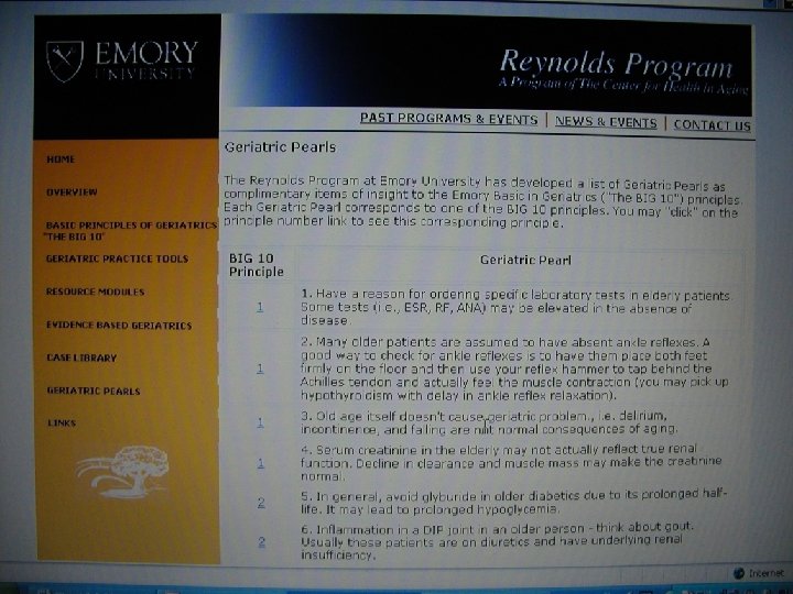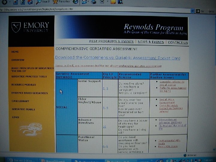 Current Geriatrics Curriculum in Family Medicine n Continuity Care Clinics n n Residents are in clinic with the same patients over the three year residency. This fosters an excellent physician patient relationship. Residents are able to assess and care for the organic, psychosocial, and spiritual aspects of their patients. Access to the Emory’s geriatrics web site for ready access to clinical tools