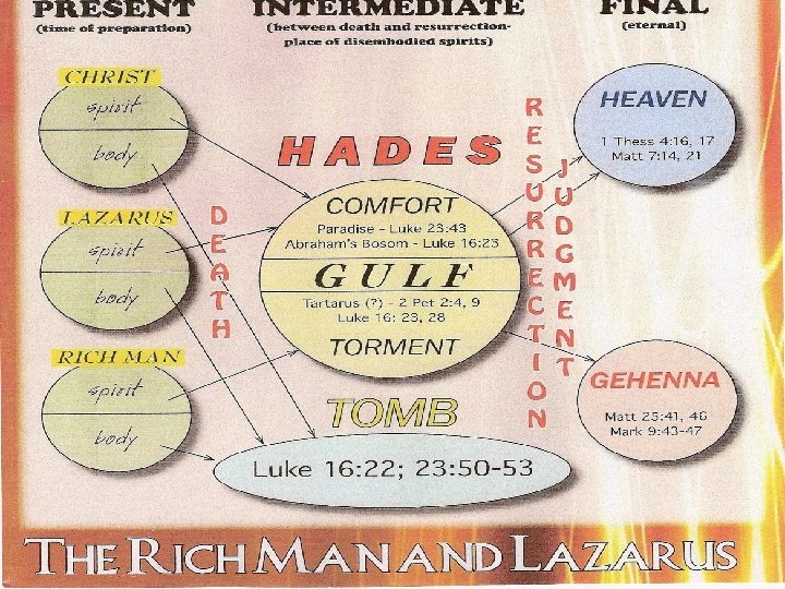 From This Impressive and Instructive Historical Story We May Learn… 1. Between death and the resurrection, there is an intermediate place of existence (Hades) where the immortal spirit abides. 2. The spirit that gives life to the body does not die with the physical body. 3. The spirit is conscious after death; it does not sleep or go out of existence (annihilated) until the resurrection as some teach.