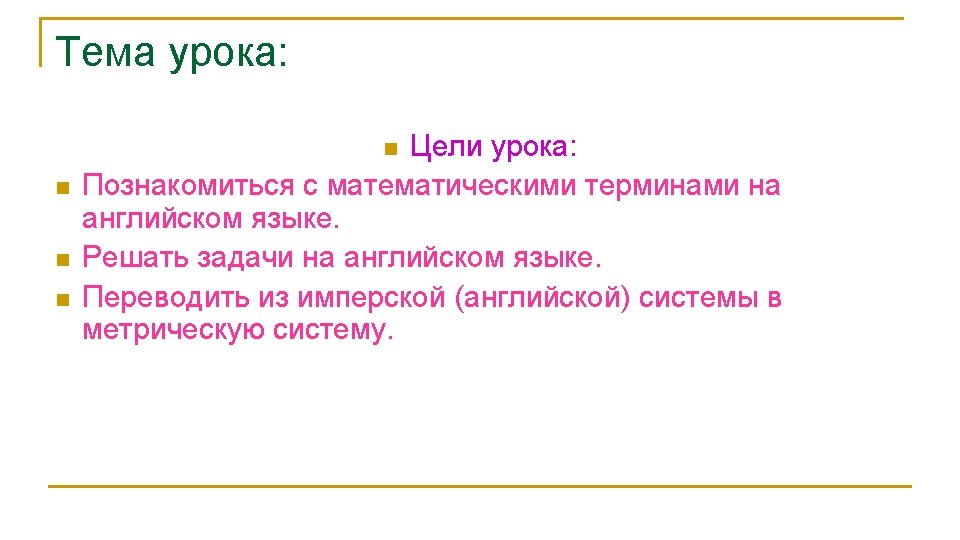 Закончи предложение 1 mile equals ……. n 1 inch is about ……. . n A 3 -foot measurement is almost……. n 1 Kilogram is just……. n 1 pound is about ……. . n 0 degrees Celsius is equal to ……. 24 degrees Celsius is equal to ……. . To convert Celcius (c) to Fahrenheit, use the formula (c * 1. 8) + 32 n
