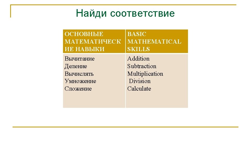 The right answer ОСНОВНЫЕ МАТЕМАТИЧЕСК ИЕ НАВЫКИ BASIC MATHEMATICAL SKILLS Сложение Addition Вычитание Subtraction Умножение Multiplication Деление Division Вычислять Calculate