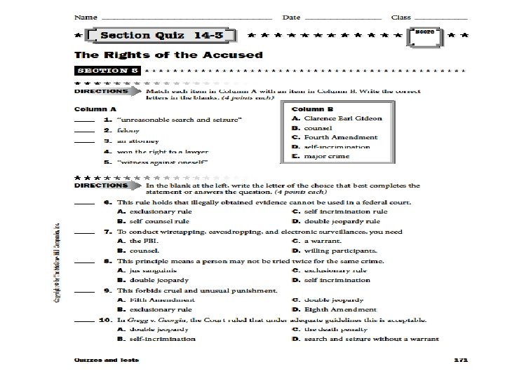III. Self-Incrimination (pages 402– 404) Why should persons accused of crimes be informed of their rights when they are arrested? To protect the accused from self-incrimination.