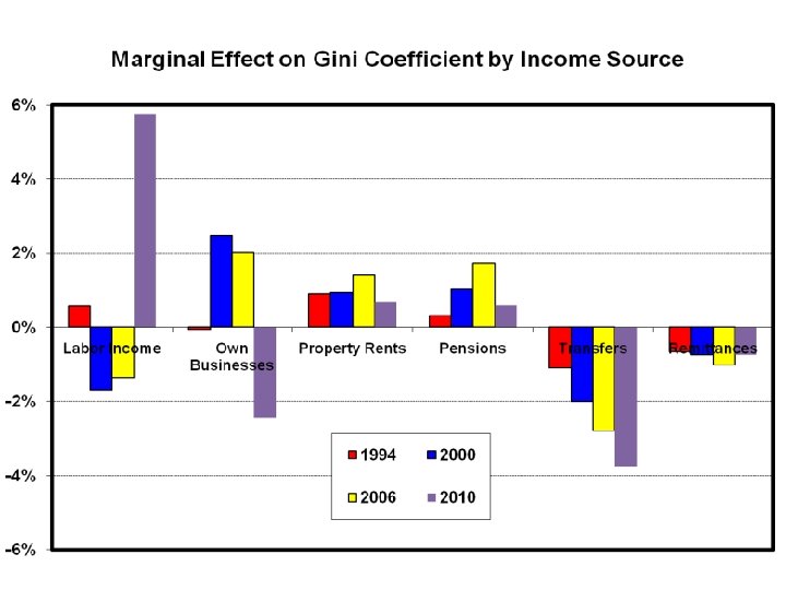 Causes of Declining Inequality: 1996 -2010 • Lerman and Yitzhaki (1985) static decomposition reveals that labor income, remittances and government transfers were equalizing after 1994 and until 2006. • In 2010, however, labor income became unequalizing while the other two continued to be equalizing.