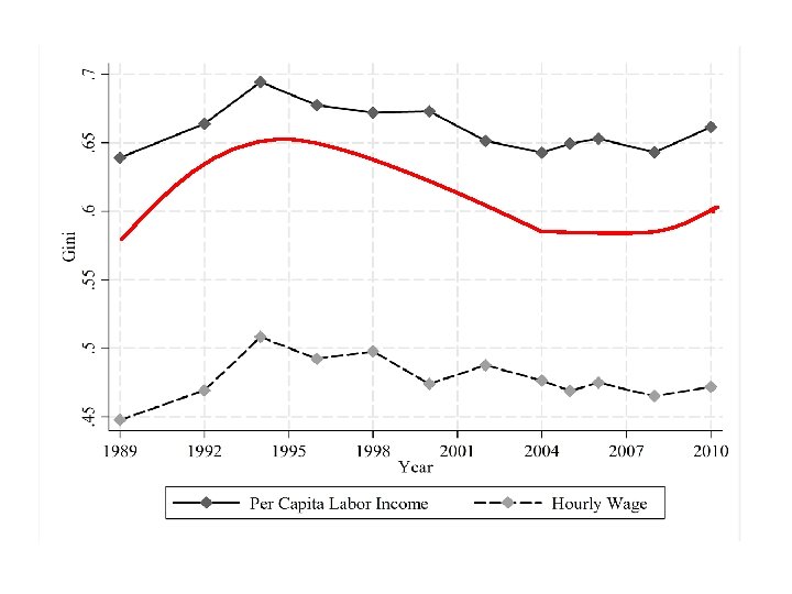 Supply, Demand or Institutional Factors? 1996 -2010 • For the period 1996 -2010, institutional factors are relatively unimportant given that they remained practically constant throughout the period. • This suggests that only supply and demand factors are at play. • Given that relative supply increased and relative returns declined, it must be the case that growth in the relative supply outpaced growth in the relative demand. • Petering out of unequalizing effects of marketoriented reforms?