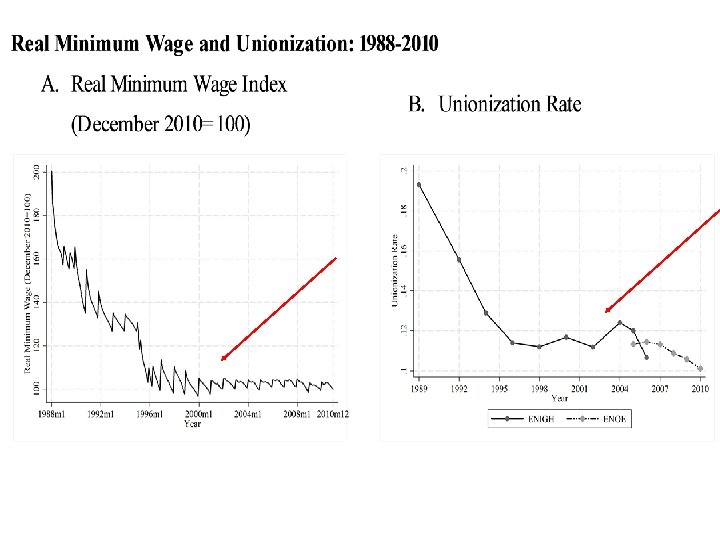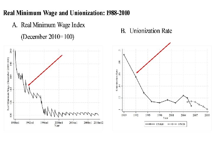 Inequality in labor earnings and hourly wages • Given the importance of labor market inequality dynamics in explaining the trend in overall inequality, this paper examined the role of: – institutional factors: minimum wages and unionization rate) and – market factors: relative demand supply of labor by skill