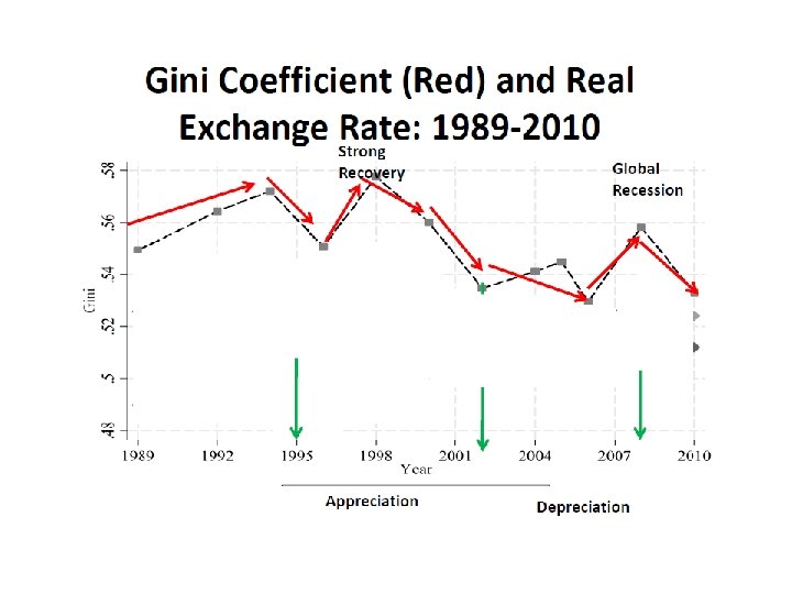 Macroeconomic variables and inequality trends • For example, inequality increased when average growth was negative in the 1980 s, increased during the speedy recovery of 19952000 and declined during the period of anemic growth 2000 -2006. • Likewise, inequality both increased and declined when the peso was appreciating or depreciating. • Hence, the explanation must be found elsewhere.