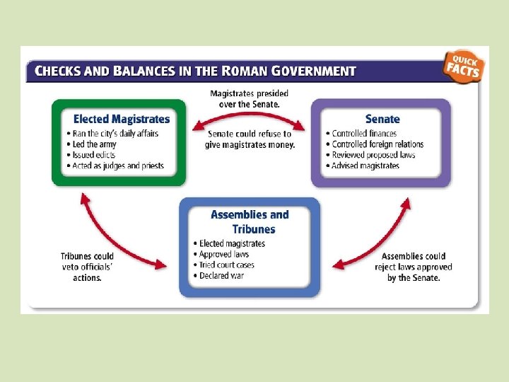 Republican Government New Offices and Institutions • Patricians, plebeians worked out practical constitution • Created new offices of government • Consisted of three parts: Senate, popular assemblies, magistrates • Initially dominated by patricians; all state offices later open to both patricians, plebeians Elements of Government • Senate: 300 members, advised elected officials, controlled public finances, handled all foreign relations • Popular assemblies: in these all citizens voted on laws, elected officials • Magistrates: governed in name of Senate and people, put laws into practice, acted as priests