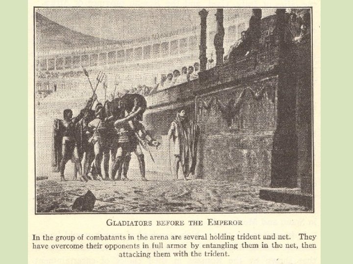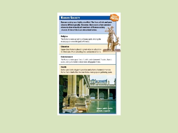 Public Entertainments • Romans of all classes enjoyed circus, chariot races • Held in Circus Maximus—racetrack could hold 250, 000 spectators • Also liked theater, mimes, jugglers, dancers, acrobats, clowns Bloody Spectacles • Romans enjoyed spectacles in amphitheaters • Wild animals battled each other and professional fighters • Gladiator contests most popular, performed in Colosseum for 50, 000 people Public Baths • Popular places for entertainment • Romans well aware of importance of bathing, hygiene for health • Many public baths had steam rooms, meeting rooms, and pools for socializing