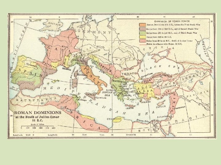 Julius Caesar • Born 100 BCE • Consul 60 BCE • First Triumvirate 60 -53 BCE: Caesar, Pompey, Crassus • Conquest of Gaul 58 -49 BCE • Attempted invasion of Britain 55 BCE • 50 BCE: Caesar-Pompey alliance breaks up • 50 -45 BCE: Civil War; Caesar wins • 44 BCE: Assassinated