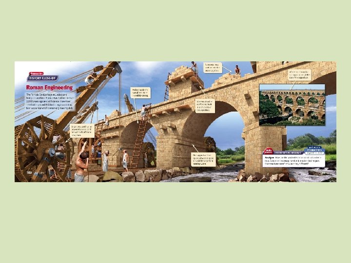 Practical Knowledge • Romans practical, tried to apply knowledge gained from science to planning cities, building water, sewage systems, improving farming • Roman engineers constructed roads, bridges, amphitheaters, public buildings, aqueducts to bring water to cities • Without aqueducts, cities would not have grown as large Concrete • Romans developed concrete, with which they built amazing structures that still stand today • Roman bridges still span French, German, Spanish rivers • Roads that connected Rome with provinces still survive today • Added urban plan to every city they conquered; many still seen today