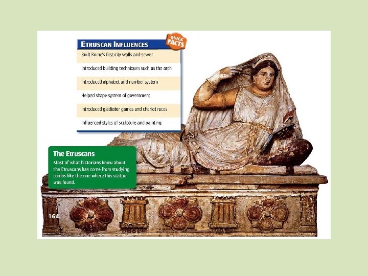 The Etruscans • Rome first ruled by Latin Kings • Came under Etruscan rule, 600 BC • Etruscans came from northern Italy – Evidence found at cemeteries indicates Etruscans great metalworkers, jewelers – Etruscan culture heavily influenced by Greeks • Etruscans had great influence on Roman society