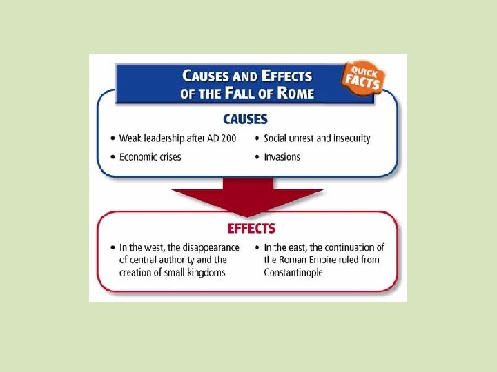 Why did Rome fall? Economic Reasons • Gap between rich and poor • Impoverished workers became tied to the land as coloni (sold as the land was sold) • As fewer members of the lower classes could afford to buy goods (no purchasing power), manufacturing and trade declined • Large estates became selfsufficient, further hurting manufacturing and trade Military Reasons • Roman Republic • Armies were servants of Rome • Roman Empire • Armies made and unmade emperors • Reliance on barbarian troops • Not ultimately loyal to Rome • Could not be counted on to fight their fellow barbarians • Interested in obtaining booty, not defending Rome or furthering Rome’s interests