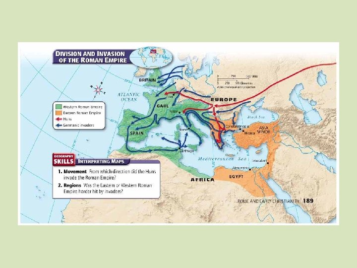 Migrating Tribes Goths • Assault on Ostrogoths frightened kinsmen, Visigoths • Visigoths fled into Roman Empire, Italy • Visigoths captured and sacked Rome itself, 410 Vandals • Other migrating tribes soon attacked Roman Empire • Infamous for destroying everything in path; Vandals attacked Rome in 450 s • Term vandal came to mean “one who causes senseless destruction” Attila • Leader of Huns, led attack on Gaul • Roman army allied with Visigoths, defeated Huns, 451 • Attila next turned on Rome; but Pope Leo I persuaded him to leave Italy