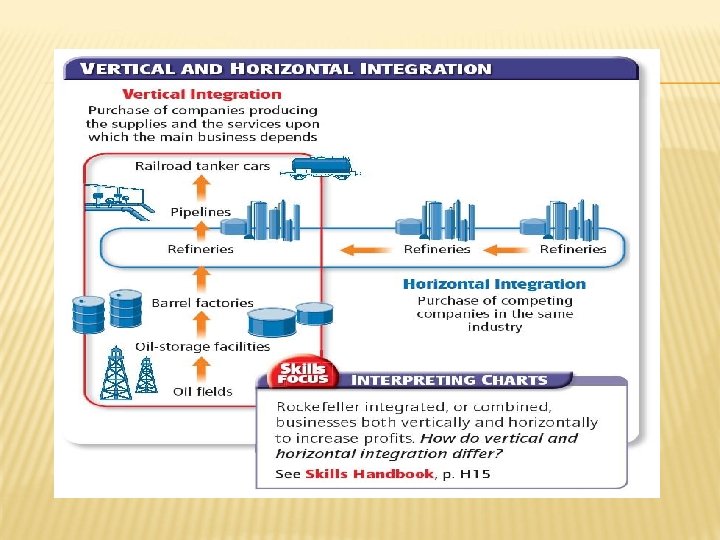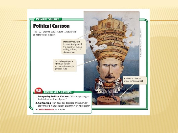 INDUSTRIAL TYCOONS TAKE OVER THE BUSINESS WORLD Rockefeller and oil • Starting with an oil refinery and superb business sense, John D. Rockefeller used both vertical and horizontal integration to capture 90 percent of the U. S. oil refinery business by 1879. • Rockefeller gave away over half of his fortune to charity. He donated millions to education and good works through his Rockefeller Foundation. Carnegie and steel • Andrew Carnegie rose from immigrant child to steel magnate. He used profits from various business investments to found his own company. By the end of the century the Carnegie Steel Company dominated the U. S. steel industry. • After retiring, Carnegie devoted his time to charity, supporting education and building public libraries.
