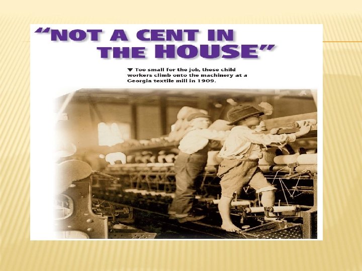 INDUSTRIAL WORKERS The workforce factory workers were immigrants or rural Americans moving to the cities for jobs. Working conditions Many Most They best jobs went to nativeborn whites or European immigrants. Less well-paying jobs were open to African Americans, as household help or laborers. By 1900, one in six children between the ages of 10 and 15 held factory jobs. unskilled laborers worked 10 -hour days, six days a week. had no paid vacation and no sick leave. Speed of production led to terrible accidents. Injured workers were replaced. Sweatshops were common. These cramped workshops set up in shabby tenement buildings were common in the garment industry.