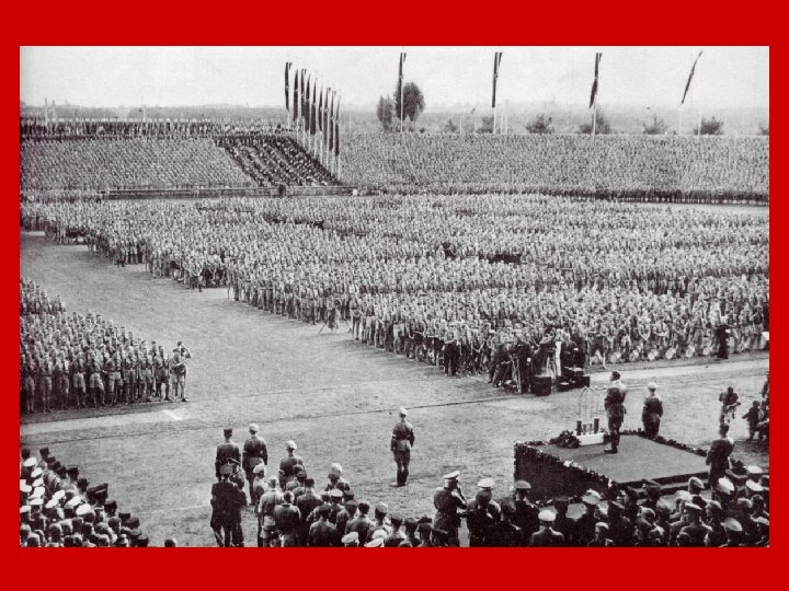 Hitler Promises if Nazis are elected to power in Germany they will undoing the Versailles Treaty • Restore German pride and power • Restore pre. WW 1 borders to include all ethnic Germans • Stabilize the German economy • Purify the German race Focuses on these to gain popular support. Sounds like FDR Not focused on but racial & anti-Semitic beliefs are known by German public.