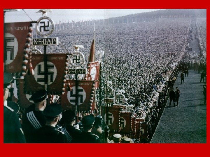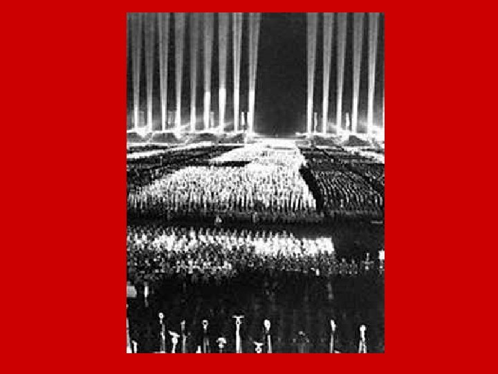 • • Nazi Party rises to power through intimidation of other political groups and mass rallies. Strong proclamations by Nazis make German people believe they can return Germany to greatness. The Nazis take power legally through winning elections. Hitler named the Chancellor of Germany in 1933. Some Germans think Hitler can be controlled by President Hindenburg. Hitler assumes total control of German government by 1934 after he burns down German Parliament (The Reichstag Fire). He blames fire on communists & socialists. He asks the parliament to protect Germany by passing the Enabling Act which “temporarily” give Hitler dictatorial powers to deal with enemies. Hindenburg dies – Hitler proclaims himself Chancellor & president (Der Fuhrer). Remember, FDR at same time was starting to strong arm our government and constitution (Court Packing Fiasco, NIRA, AAA). Always watch your leaders! Germany didn’t!