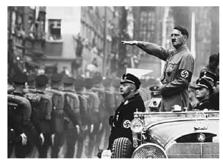 I am Adolf Hitler the leader (der Fuhrer) or dictator of Germany from 1933 to 1945. What is Nazism? • extremely fascist , nationalistic and totalitarian • based on beliefs of the National Socialist German Workers Party • belief in the racial superiority of the Aryan, the “master race” • belief that all Germans should have “lebensraum” or living space in Europe • Violent hatred towards Jews and blamed Germany’s problems on them