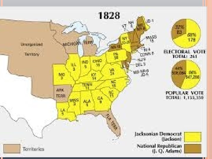 C. GOING “WHOLE HOG” FOR JACKSON IN 1828 More organized parties National Republicans- Adams Democratic-Republicans- Jackson (Democrats) Mudslinging & personal characteristics Election of 1828 Sectional Jackson- South & West (agriculture)- new voters Adams- North (manufacture)