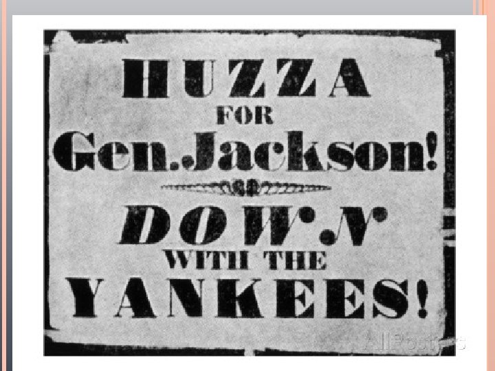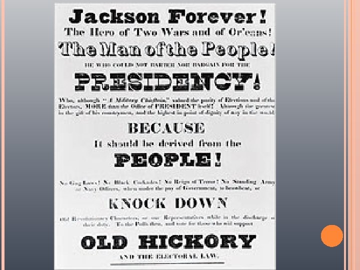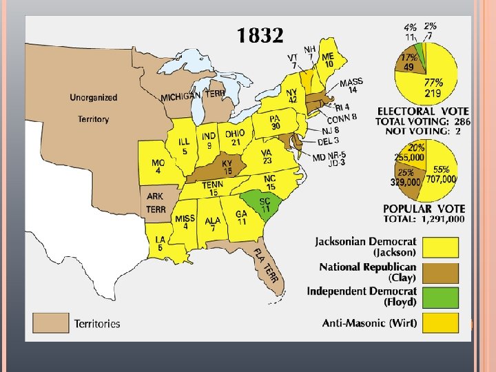 J. OLD HICKORY WALLOPS CLAY IN 1832 1 st 3 rd party- Anti- Masonic- acted as Anti-Jackson Took votes from Clay Nominating conventions- involved lots of people Party platforms Jackson’s popular appeal won the election