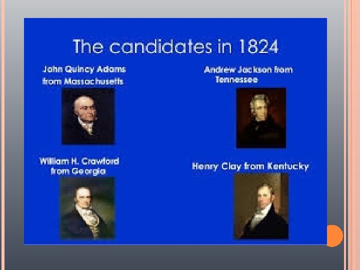 A. THE CORRUPT BARGAIN (1824) Election of 1824 J. Q. Adams, Henry Clay, Andrew Jackson, William Crawford (don’t care) Jackson won popular vote, not electoral- House Adams/Clay deal- Sec. of State