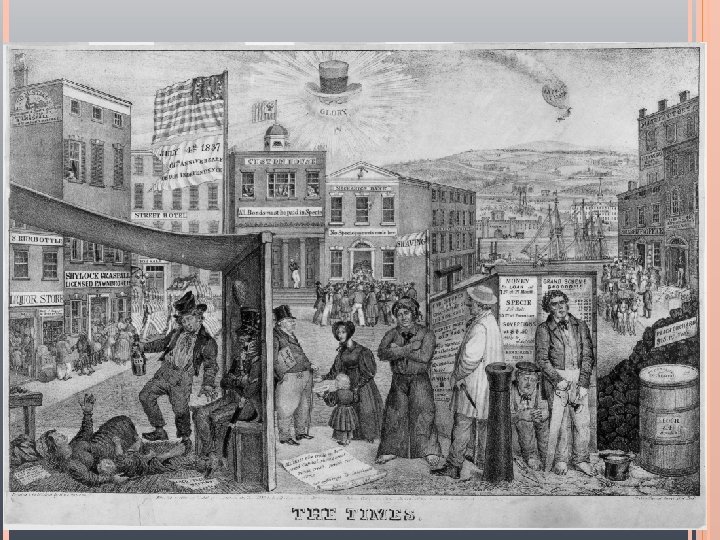 K. BURYING BIDDLE’S BANK Bank to expire in 1836 - no more deposits Biddle called in bank loans People lost property Currency destabilized Funds in “pet banks” Specie circular- all public lands had to be purchased with metallic money- stop speculation Panic of 1837