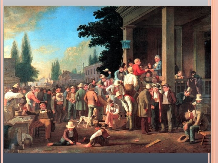 CHANGE IN ELECTORATE By mid-1820 s most states dropped property qualifications for voting -still had to be a white man Pennsylvania 1790 – all men who paid taxes Vermont 1791 – universal manhood suffrage Kentucky 1792 Tennessee – modest taxpaying qualification Conn (1818), Mass (1821), NY (1821) abolished property requirements for voters By 1828 pop vote in all but SC (1832)
