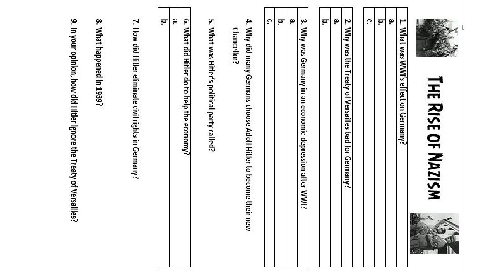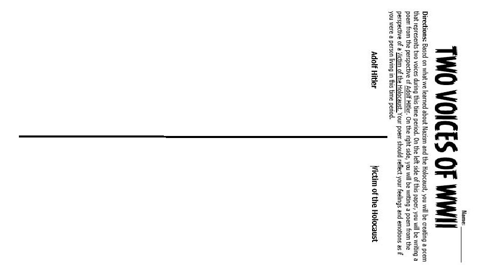 Your Turn • Based on what we have learned about Nazism and the Holocaust, you will be creating a poem that represents two voices during this time period. • On the left side of this paper, you will be writing a poem from the perspective of Adolf Hitler. • On the right side, you will be writing a poem from the perspective of a Victim of the Holocaust. • Your poem should reflect your feelings and emotions as if you were a person living in this time period.