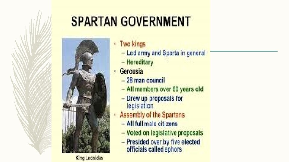 Reforms 4. 3 Three Parts of Sparta Constitution: o This balanced institution was considered by many, including Plato and Aristotle, to be a model for other poleis. o The Spartan constitution or rhetra in Greek language, in its developed form had three parts: (1) The dual kingship; (2) The council of elders, or Gerousia; (3) And the Assembly.