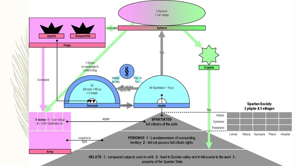 Travelling v And so Lycurgus was asked to undertake his reforms. v Now realizing that Sparta was in need of reform, Lycurgus set off a series of travels and went first to Crete. v The Cretans were related to Spartans; both of them were Dorians and came from the northern Greece to the South after the fall of the Mycenaean. v Lycurgus studied the characteristic institutions of Crete. v Then he went to Ionian, Asia Minor where the Iliad was composed, and there he also studied their Greek institutions and compare the softness of love of luxury that characterizes the Ionians with the rigorous war-like society of Crete. v And then he also went to Egypt. He then came back to Sparta and carried out his reforms