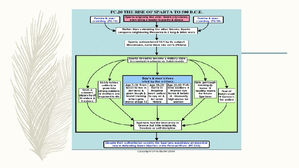 The Cost of Utopia Martial State q Another thing which has much to do the Spartan lifestyle is its demographic difficulties—a shrinking population. q Sparta was the only Greek state in which male infanticide was institutionalized. q Moreover, many deaths can be explained by the Spartan soldier’s obligation to stand his ground and give his life for his country, rather than surrender. q This ideal was reinforced by peer pressure, epitomized by statements attributed to Spartan women such as that of the mother who told her son as she handed him his shield to come home “either with this or on this. ”
