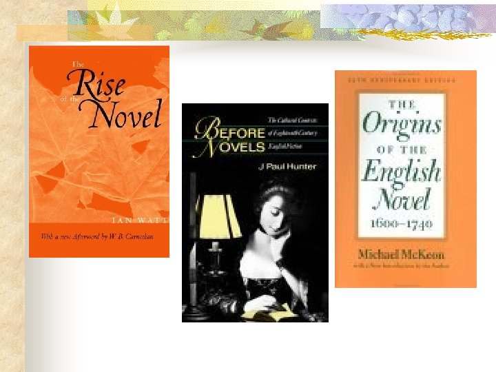 Hybrid genre The novel n n encompasses many different sub-genres is always in search of a definition battled with other genres from the very beginning different theories on its rise Ian Watt, Formal Realism (1957) n Michael Mc. Keon, Progressive Narrative (1987) n J. Paul Hunter, Specific Features of the novel (1990) n