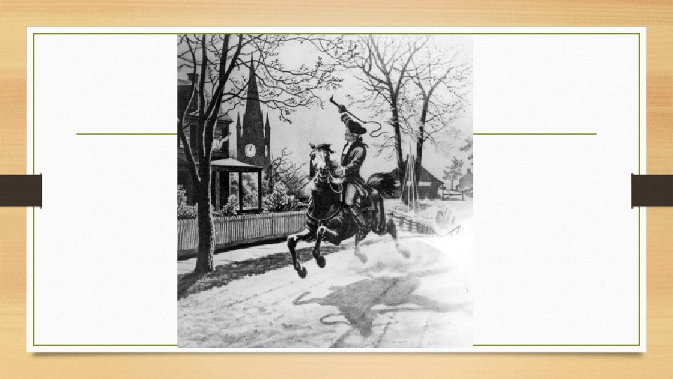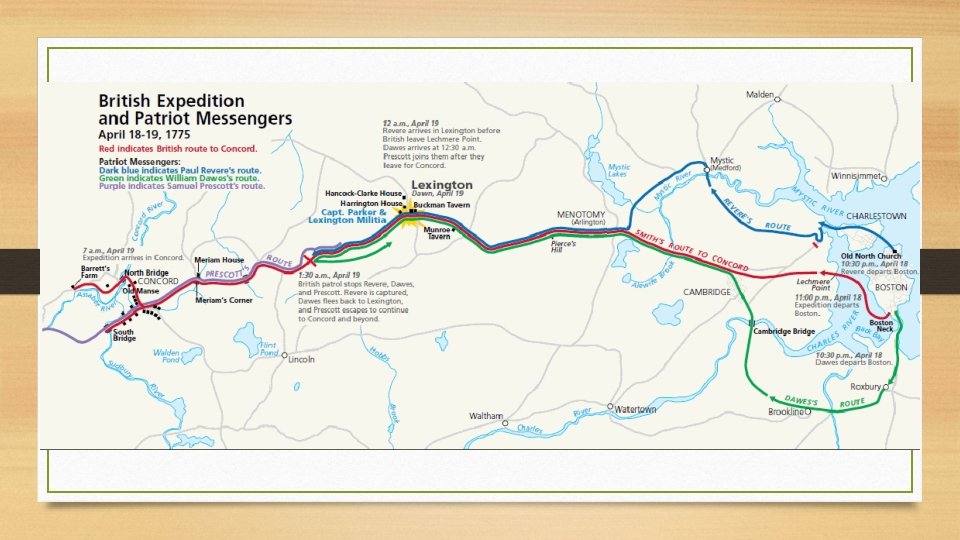 The British Regulars are coming! The Midnight Ride • The British government attempted to arrest Samuel Adams and John Hancock, two members of the Sons of Liberty • Prepared, Paul Revere rowed across the Charles River and borrowed a horse, stopping at each house to alert people that the British were coming • At midnight, he arrived in Lexington where Adams and Hancock were staying There were actually 3 riders dispatched on different routes: Revere, Dawes, and Prescott