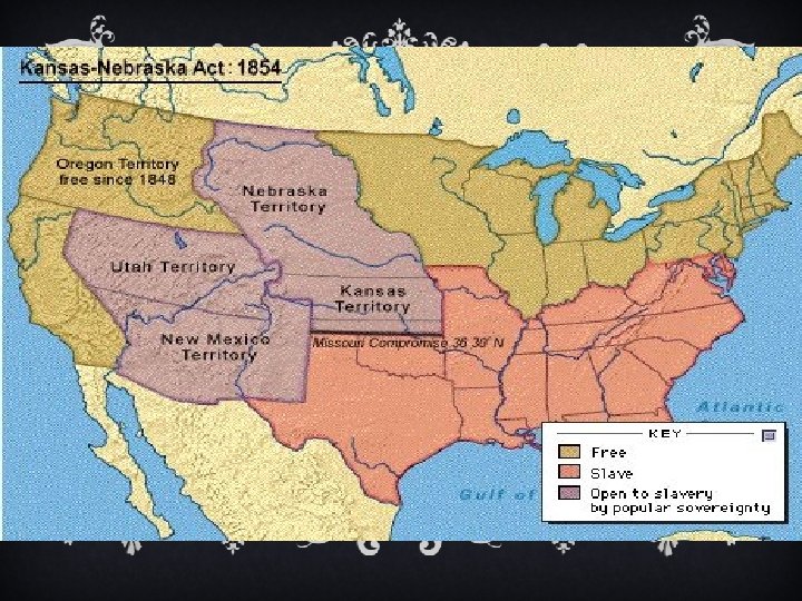 KANSAS-NEBRASKA ACT vdivided Nebraska Territory into Nebraska and Kansas vallowed them to decide slavery issue by popular sovereignty (let the people decide) vdid away with the 36 30' line of the Missouri Comp. v"Death of the Missouri Compromise"