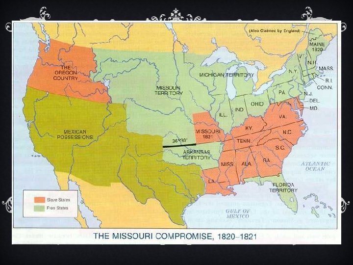 MISSOURI COMPROMISE v. Split the country politically into 2 parts: north & south v. Missouri enters union as slave state v. Maine enters union as free state v. Slavery banned in the Louisiana Territory north of the 36 30' line