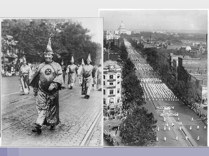 § Led to rebirth of Klan, this time centered in Midwest (Indiana) § Claimed over 5 million members § Thousands marched in DC 1925, 1926