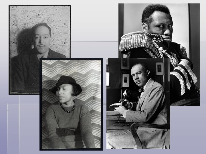 Harlem Renaissance § Flowering of black arts, music, literature and intellectualism in Harlem, New York § Langston Hughes, Countee Cullen, Claude Mc. Kay, Zora Neale Hurston, Alain Locke , Paul Robeson, James Weldon Johnson, Paul Dunbar